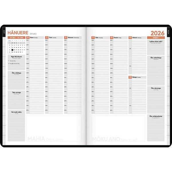 This Tuhi A4 Bilingual Diary has a week to view Mahere ā wiki layout. This layout is ideal for those who need to have an at-a-glance view of their entire week and to make brief notes for appointments and meetings. The diary includes important Māori dates, public holidays and other significant dates, karakia, kōrero, ko wai au and waiata to use as well as layouts for Matariki and Maramataka. There is also space for goal planning and weekly reflections.