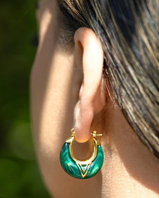 Available in 3 colours: green, orange and white resin 25mm hoops with 18k gold plating.